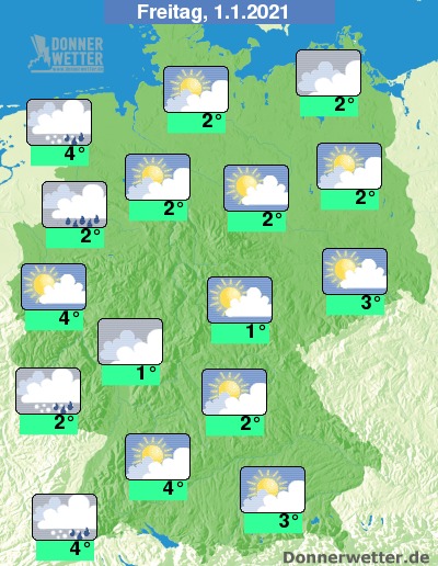 Sowohl im Norden und dort wo Frankreich nahe ist fällt am Silvestertag teilweise Regen oder Schneeregen, im Schwarzwald und im Hunsrück auch Schnee. In den anderen Gebieten wechseln sich Wolken mit gelegentlichen Sonnenstrahlen ab.