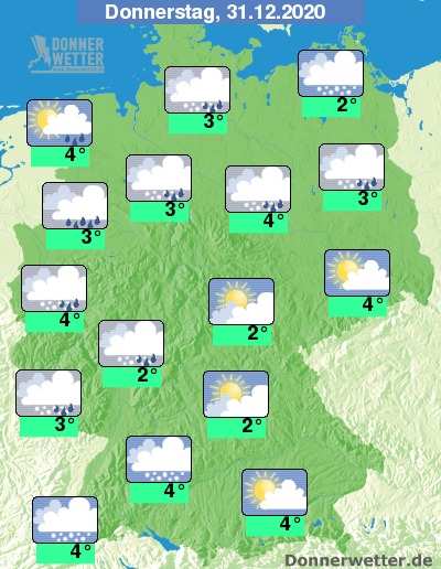 Am Silvestertag kommen in Teilen West- und Norddeutschland neue Niederschläge auf, die in den Niederungen als Regen oder Schneeregen, in höheren Lagen meist in Form von Schnee fallen. Sonst lässt sich gelegentlich auch mal für kurze Zeit die Sonne blicken.