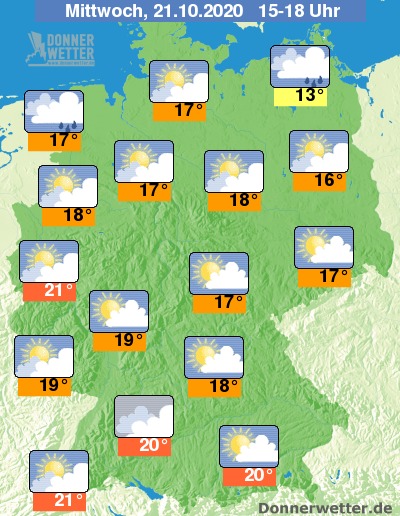 Die Temperaturen bewegen sich zwischen 13 und 16 Grad im Norden. In den übrigen Landesteilen werden mildere 17 bis 21 Grad erreicht, an den Alpen bei möglichem Föhndurchbruch vielleicht auch nahe 25 Grad.