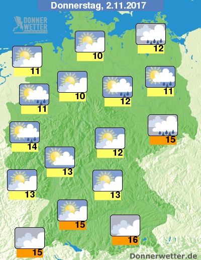 Am Donnerstag ist es über dem Land häufig stark, hier und da aber auch nur leicht bewölkt, dabei ist im Tagesverlauf etwas Regen möglich, im Süden bleibt es trocken. Die Temperatur steigt auf 10 bis 16 Grad, Im Umfeld von Nord- und Ostsee ist es zum Teil stürmisch.