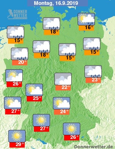 Am Montag halten sich über der Nordosthälfte der Republik meist dichte Wolken und es fällt zeitweise Regen. Besonders im Süden, aber auch in der Landesmitte und im Westen ist es oft heiter, teils ziehen auch einige Wolken durch, dabei bleibt es trocken. Die Temperatur steigt auf kühle 15 Grad an der Nordsee und bis zu 29 Grad in Freiburg.