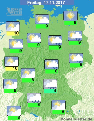 In der Nordhälfte gibt es eine freundliche Mischung aus Sonne und Wolken. Im Nordseeumfeld, sowie über Schleswig-Holstein kann es nachmittags zu einzelnen Schauern kommen. Die Höchsttemperaturen liegen allgemein zwischen 3 und 10 Grad, wobei die niedrigeren Werte an den Alpen und in der Oberpfalz zu erwarten sind. Der Wind weht meist nur schwach bis mäßig, kann aber abends an der See auffrischen. In der Nacht auf Samstag droht bei längerem Sternenhimmel die Gefahr von leichtem Frost und Reif.