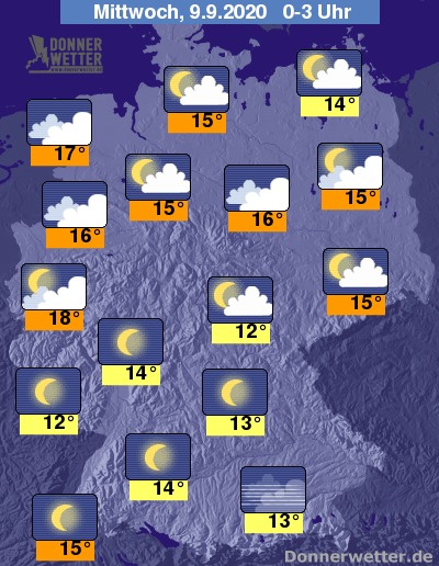 Während der zweiten Nachthälfte verdichtet sich im Norden die Wolkendecke wieder von der Nordsee und den Niederlanden her, nennenswerter Regen fällt jedoch nicht. Im Süden leuchten verbreitet Mond und Sterne. In Südbayern kann sich insbesondere an Gewässern stellenweise Nebel bilden.