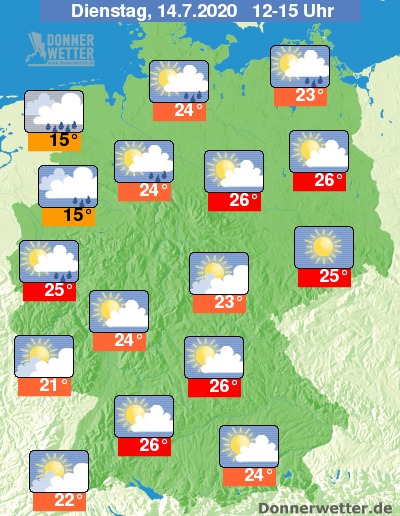 Die Temperaturen bewegen sich vom Münsterland bis nach Schleswig-Holstein meist nur zwischen 15 und 20 Grad, im großen Rest werden angenehme bis sommerliche 21 bis 28 Grad erreicht.