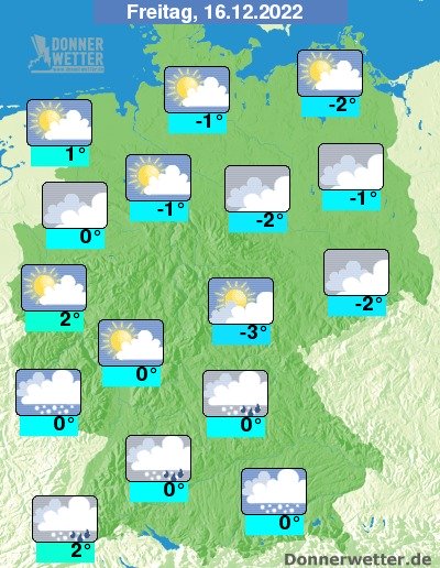 Am Freitag ist es im Süden bedeckt und es fällt zeitweise Schnee, zum Teil auch Schneeregen, dabei ist erhebliche Glätte möglich! Im Osten ist es stark bewölkt, jedoch meist trocken. Im übrigen Land ist es zum Teil heiter, teils einige Wolken durchziehen, dabei bleibt es weitgehend trocken. Die Temperatur steigt auf -3 Grad im Vogtland und bis 2 Grad im Rheinland.