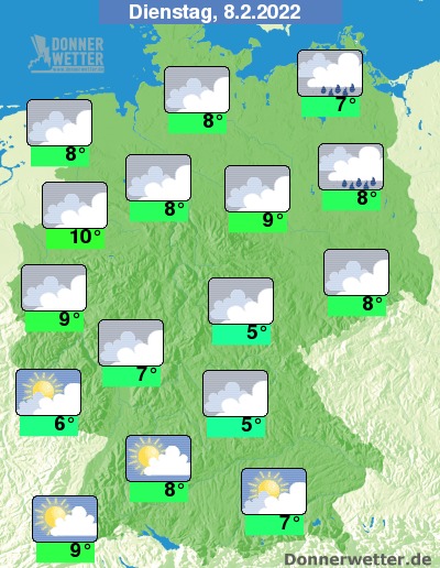 Am Dienstag halten sich überwiegend dichte Wolken oder es ist neblig-trüb. Südlich des Mains ist es zum Teil sonnig, hier bleibt es trocken. Im übrigen Bundesgebiet können gebietsweise einige Tropfen fallen. Die Temperatur steigt auf 5 Grad in Mittelfranken und bis 10 Grad im Münsterland. An den Küsten weht ein oft stürmischer Wind.