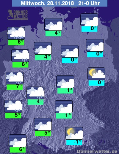 Am Abend fällt vom Emsland bis zum Oberrhein gelegentlich leichter Regen oder Sprühregen. Im übrigen Land ist es meist bewölkt aber trocken, nach Osten hin zeigen sich auch die Sterne.