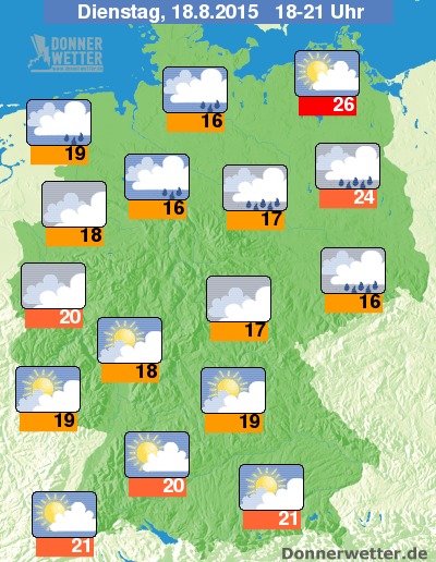 In den Abendstunden des Dienstags hält das Wetter soweit in den meisten Regionen an. Die Tiefswerte liegen bei 23 Grad C bis 14 Grad C.
