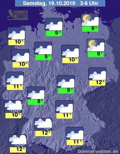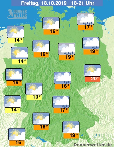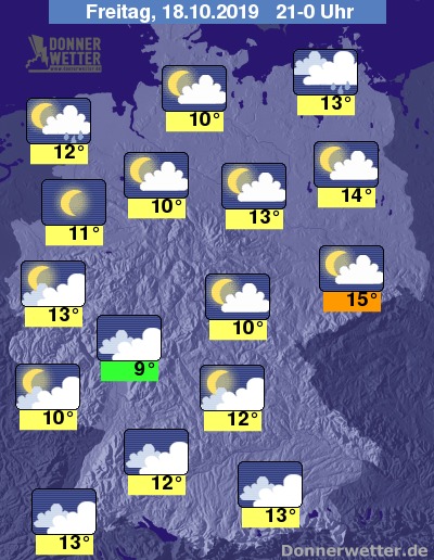 Die Temperaturen liegen vor Dämmerungsbeginn zwischen 13 Grad im Rhein-Main-Gebiet und angenehmen 20 Grad in der Lausitz.