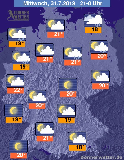 Am Abend gehen teilweise noch Schauer und Gewitter nieder, sonst präsentiert sich der Himmel wechselnd wolkig, im Osten auch stärker bewölkt. Im Südwesten kann man die allmählich untergehende Sonne noch längere Zeit genießen. Hier sollte es auch trocken bleiben.