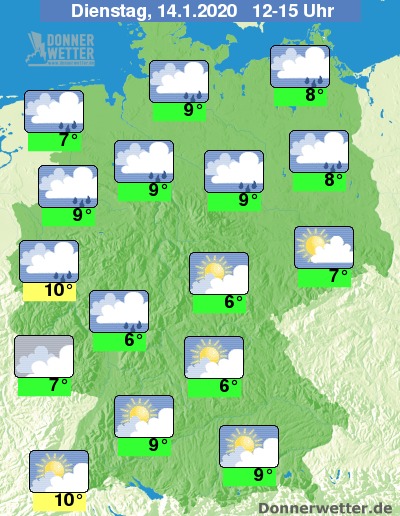 Am frühen Nachmittag hält sich über dem Westen und Norden meist eine kompakte Wolkendecke, aus der es gelegentlich leicht regnet oder nieselt. Im Osten und Süden gibt es hingegen größere Aufheiterungen und es bleibt in der Regel niederschlagsfrei.
