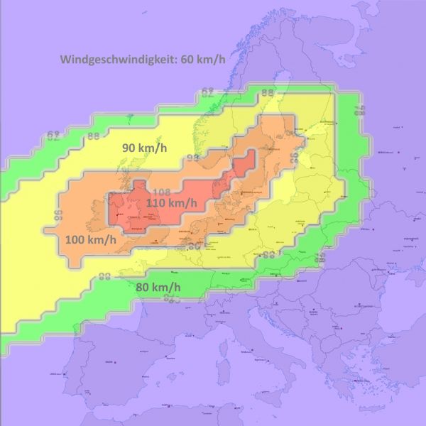 Die nachfolgende Karte zeigt die durch Sturm Iwan zu erwartenden Windgeschwindigkeiten in Europa für den 19.11.2015 (00:00 bis 06:00 Uhr):