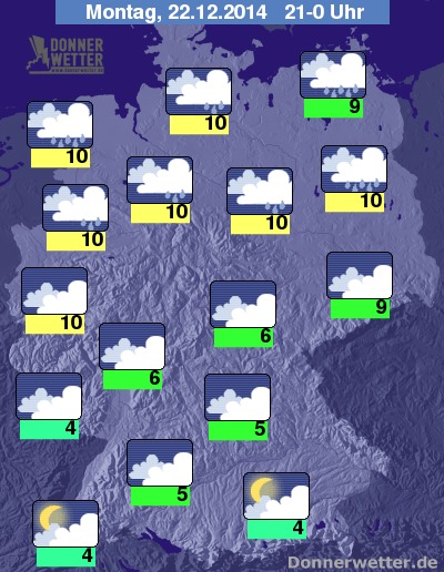 Heute Abend bleibt die Wolkendecke überwiegend verschlossen, nur im Süden kann es auch häufiger auflockern, dabei bleibt es hier trocken. Besonders im Norden des Landes fällt ein teils kräftiger Regen, aber auch in der Mitte der Bundesrepublik fällt zeitweise Regen. Mit Ausnahme des Südens weht noch ein frischer bis starker, an der See auch ein stürmischer Wind. Die Abendtemperatur liegt bei 10 Grad in der Norddeutschen Tiefebene und um 4 Grad im Alpenvorland.