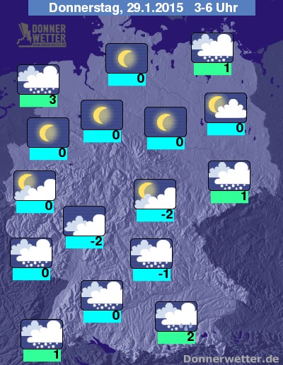 In der Nacht zum Donnerstag fällt vor allem Im Stau der Nordalpen, aber auch im übrigen Süddeutschland sowie in Sachsen und an der Ostsee teils kräftiger Schnee. An der Nordsee sind bei meist dichten Wolken teils kräftige Graupel- und Schneegewitter möglich. Sonst klart der Himmel besonders im Norden Deutschlands verbreitet auf und es bleibt trocken. In der Mitte des Landes ist es teils stark, teils aufgelockert bewölkt, aber ebenso trocken. Die Tiefstwerte liegen bei 3 Grad am Jadebusen und -2 Grad im Coburger Land. Vor allem in der Nordhälfte weht noch ein oft frischer und teils starker, in Böen stürmischer Wind, an der See und auf den Bergen sind noch Sturmböen möglich.