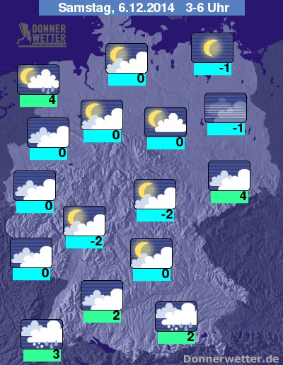 In der Nacht zum Samstag bleibt der Himmel überwiegend bedeckt oder es bleibt trüb, nur hier und da lockert es auch mal etwas auf. In der zweiten Nachthälfte bringen dichte Wolken sowohl im Süden als auch im äußeren Westen zeitweise leichten Regen, Schneeregen oder Schnee, dabei kann es gefährlich glatt werden. In den anderen Regionen bleibt es trocken. Es bildet sich stellenweise Nebel oder Hochnebel. Die Temperatur liegt zum Morgen bei rund 4 Grad in Zittau und um -2 Grad am Odenwald.