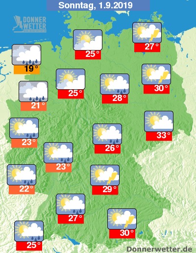 Die Temperaturen erreichen Höchswerte um nur noch 19 Grad an der Nordseeküste und um 33 Grad im Zittauer Gebirge.