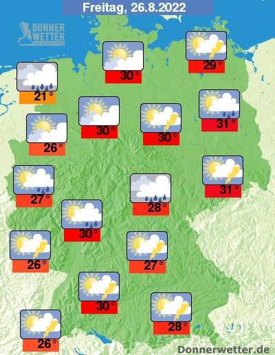 Die Temperaturen erreichen am Freitag Höchstwerte um 21 Grad in Ostfriesland, 26 Grad am Oberrhein und schwül-heißen 31 Grad an der Spree.