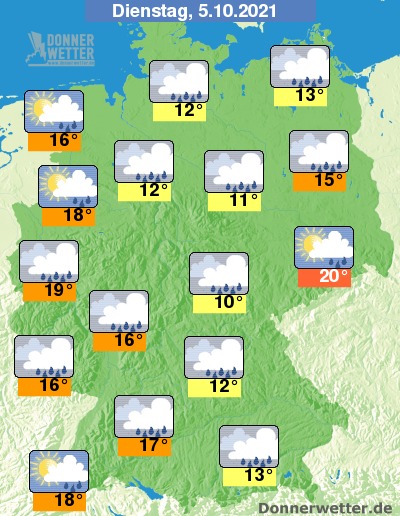 Am Dienstag halten sich überwiegend dichte Wolken, vor allem über den westlichen Landesteilen können sich aber auch Aufheiterungen zeigen. Es fällt zeitweise Regen bei Höchstwerten von 10 Grad am Thüringer Wald und bis 20 Grad in der Lausitz.