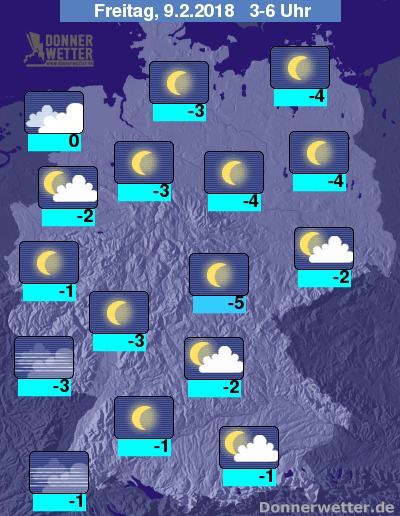 Dazu wird es allerdings knackig kalt. In den Morgenstunden liegen die Temperaturen an der Nordsee unter einer dichten Wolkendecke bei Werten um den Gefrierpunkt. Im Rest des Landes herrscht hingegen Frost bei Tiefstwerten bis -5 Grad, stellenweise wird es sogar noch etwas kälter.