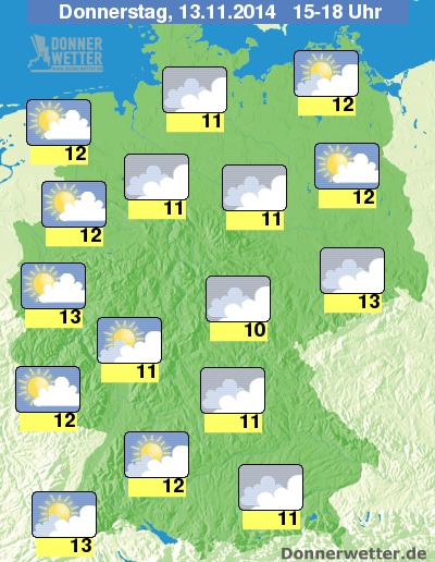 Heute Nachmittag hält sich noch häufig eine geschlossene Wolkendecke, dazu fällt aber nur hier und da mal etwas Regen oder Sprühregen. Die besten Chancen für Auflockerungen oder auch heitere Abschnitte bestehen vom Emsland, über NRW, Rheinland-Pfalz bis ins Saarland, sowie im Raum Berlin-Brandenburg, hier bleibt es auch weitgehend trocken. Die Temperatur liegt bei milden und recht einheitlichen Werten zwischen 10 Grad am Thüringer Wald und gut 13 Grad in der Kölner Bucht.