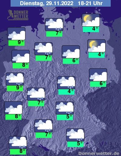 Heute Abend ist es bedeckt oder trüb und Auflockerungen bleiben sehr selten. Im Osten, Nordosten und westlich des Rheins bleibt es zumindest weitgehend trocken, sonst fällt gebietsweise Regen oder Sprühregen. Die Temperatur liegt bei 4 Grad in Stralsund und bis 9 Grad in Bremerhaven.