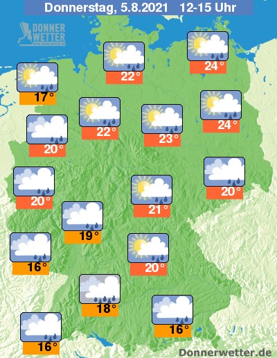 Heute Nachmittag zeigen sich hier und da Auflockerungen oder heitere Abschnitte, häufig ziehen aber dichte Wolken durch, dabei bilden sich gebietsweise Schauer, vereinzelt entwickeln sich zudem auch Gewitter. Die Temperatur steigt auf teils nur 16 Grad im Saargau und bis 24 Grad in Berlin.