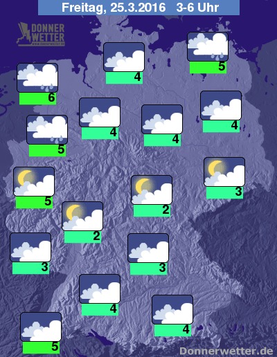 In der folgenden Nacht ist es über der breiten Landesmitte anfangs noch teils aufgelockert bewölkt, sonst hält sich jedoch weitgehend dichte Bewölkung, dabei regnet es zunächst nur im Norden und Westen zeitweise. Bis zum Morgen ziehen die dichten Regenwolken aber auch in den Süden und Osten Deutschlands. Die Temperatur sinkt auf 6 Grad an der niederländischen Grenze und bis 2 Grad in Oberfranken.