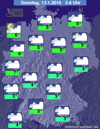 In der Nacht zum Sonntag bleibt es wolkenverhangen und es fällt immer wieder auch Regen, im Süden oft auch Schneeregen oder Schnee. Die Temperatur sinkt auf 7 bis 3 Grad.