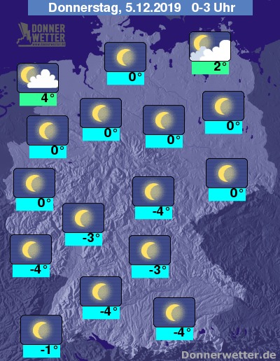 Die Temperaturen liegen mit Tiefstwerten um 0 bis -4 Grad nahezu bundesweit im Frostbereich, nur im locker bewölkten Küstenumfeld ist es mit +4 bis +2 Grad etwas milder.