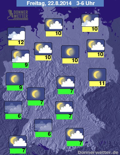 In der Nacht zum Freitag bleibt es im Küstenumfeld und auch im Nordwesten des Landes meist stark bewölkt, dabei bleibt es jedoch meist auch trocken. In den übrigen Landesteilen ist es vor allem in der Südosthälfte verbreitet klar, sonst ist es locker bewölkt. Bei Tiefstwerten von 12 Grad in Ostfriesland und 6 Grad am Schwarzwald bleibt es ansonsten trocken.