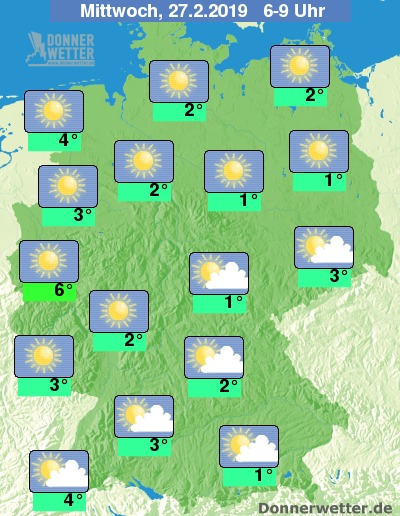 Die Wochenmitte startet in der gesamte Nord- und Westhälfte mit viel Sonnenschein, im Süden und Südosten ist es zumeist locker bewölklt. Es bleibt trocken bei Werten um 1 bis 6 Grad C.