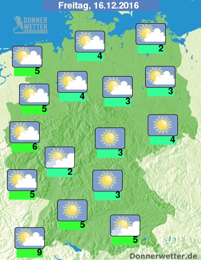 Auch am Freitag setzt sich nach Auflösung der Nebelfelder wieder vielerorts die Sonne durch, lediglich an Main und Donau tut die Sonne sich lange schwer. Die Höchstwerte liegen zwischen 2 Grad an der Ostsee und 9 Grad am Oberrhein.