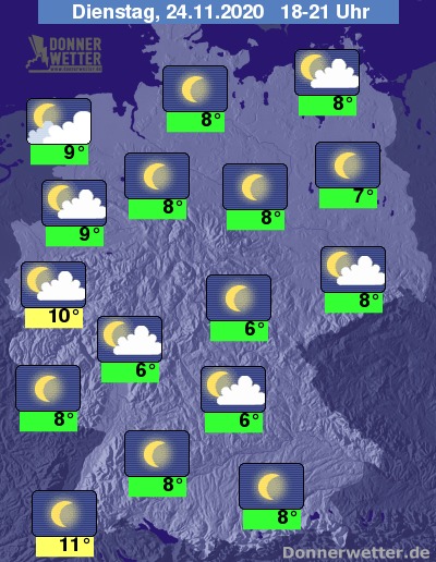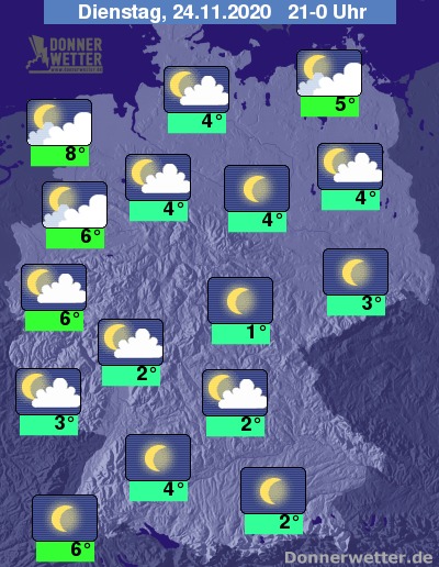 Bis Mitternacht ändert sich nicht viel. Lediglich im Küstenumfeld von Nord- und Ostsee werden die Wolkenschleier etwas dichter.