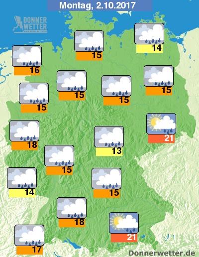 Die neue Wetterwoche startet verbreitet nass, jedoch einigermaßen mild. In Sachsen und Bayern ist es anfangs noch oft locker bewölkt und trocken, sonst fällt bei dichter Bewölkung jedoch immer wieder, teils auch langanhaltender Regen. Die Temperatur steigt auf 13 bis 21 Grad.