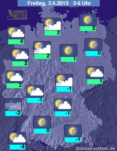 In der kommenden Nacht lockert auch die Bewölkung im Alpenvorland und in Sachen häufig auf, dazu bleibt es weitgehend trocken. Besonders in der Mitte des Landes ziehen dagegen oft dichte Wolken auf und hier und da ist etwas Schnee, Schneeregen oder Regen möglich. Im übrigen Land ist es teils sternenklar, teils locker oder aufgelockert bewölkt und trocken. Die Temperatur sinkt auf 4 Grad in Ostfriesland und bis -4 Grad am Bodensee.