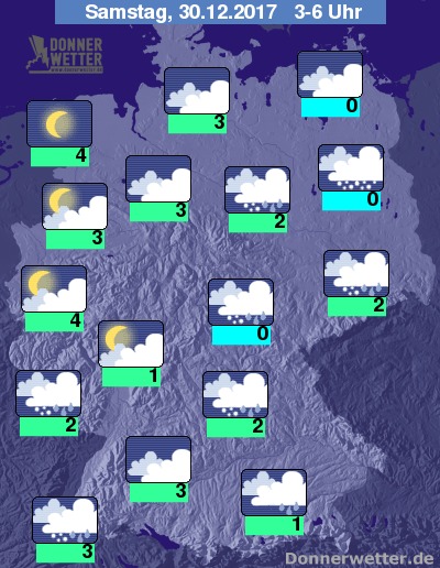 In der folgenden Nacht ziehen dichte Wolken mit Schnee, Schneeregen oder Regen weiter in die Osthälfte der Republik und erreichen zum Morgen hin auch die östlichsten Landesteile. Es besteht häufig Glättegefahr! Nach Westen hin klingen die Niederschläge wieder ab und hier und da kann es auch etwas auflockern, oft bleibt es aber stark bewölkt. Die Temperatur sinkt auf 4 bis 0 Grad.