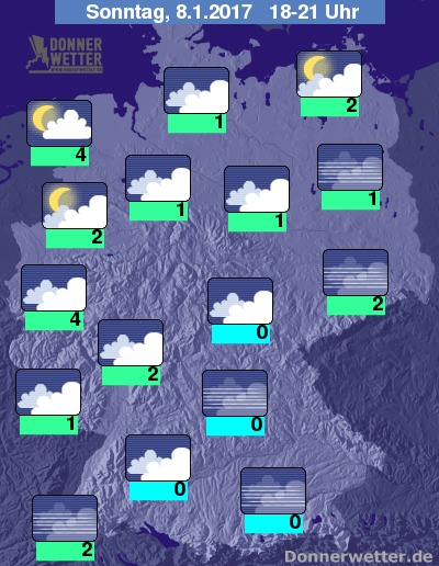 Heute Abend lockert es im Umfeld von Nord- und Ostsee meist auf, im übrigen Land ist es verbreitet stark bewölkt oder neblig-trüb, jedoch fällt nur selten Schnee, Schneeregen oder Regen. Die Abendtemperatur liegt zwischen 0 und 4 Grad.
