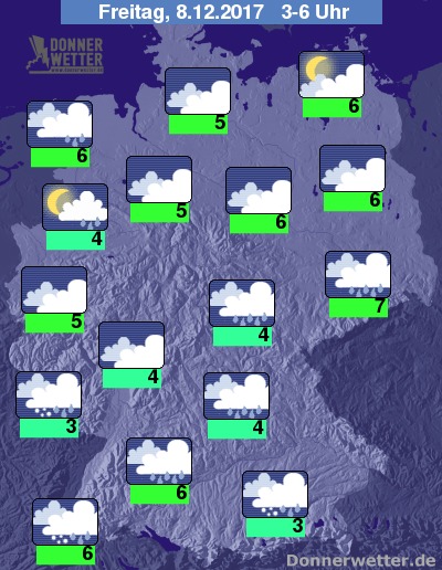 Bis zum Morgen verschieben sich die Niederschläge zunehmend südostwärts und erreichen dann auch das Erzgebirge, den Bayerischen Wald und den Alpenrand, während es im Norden langsam wieder abtrocknet. Oberhalb von 400 bis 700 Metern geht der Regen im Lauf der Nacht mehr und mehr in Schnee über. Am Morgen ist verbreitet mit Straßenglätte zu rechnen.