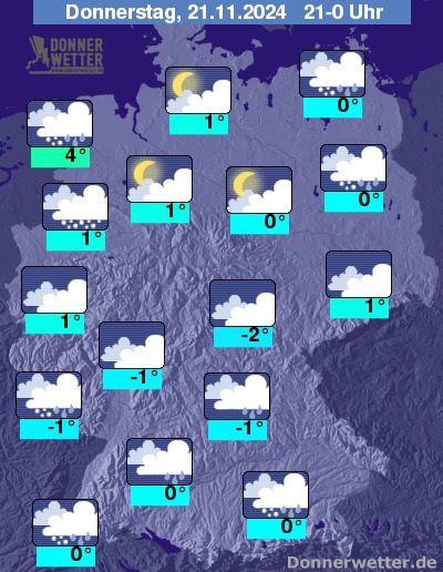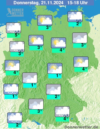 Am Donnerstagnachmittag fällt im Norden noch zeitweise Niederschlag, teils bis in tiefe Lagen auch als Schnee, Schneeregen oder Graupel. Im Süden und Südwesten nimmt die Bewölkung zu und es muss mit teils kräftigen Schneefällen gerechnet werden. Sonst wechseln sich Sonne und Wolken am Nachmittag verbreitet ab und es bleibt meist trocken.