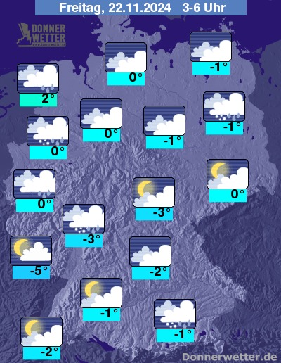 In der Nacht zum Freitag ist es über der Nordhälfte wechselnd bewölkt und es fällt Schneeregen oder Schnee. Auch im Süden anhaltender Schneefall, der sich im weiteren Verlauf an die Alpen zurückzieht. Dazwischen bleibt es zumeist niederschlagsfrei.