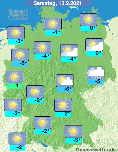 Heute ist das Wetter verbreitet sonnig und trocken, über Brandenburg und Thüringen ist es dagegen oft stärker bewölkt, hier bleibt es aber ebenso trocken. Über Sachsen fällt bei meist dichten Wolken jedoch gebietsweise Schnee. Die Temperatur steigt auf -6 Grad in Jena und bis 1 Grad in Köln.