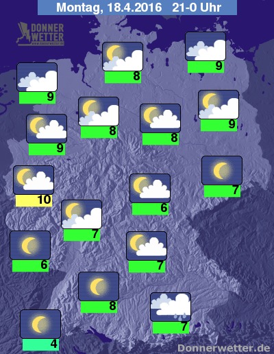 Heute Abend fällt am Alpenrand zeitweise Regen, sonst lockert oder klart der Himmel vor allem über der Südhälfte verbreitet auf und es bleibt trocken. Im Norden werden die Wolken hingegen oft dichter, teils ist es aber auch locker bis aufgelockert bewölkt, es bleibt zum Großteil trocken. Die Abendtemperatur liegt bei 10 Grad in Aachen und um 4 Grad im Breisgau.