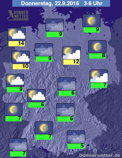 Die Temperaturen sinken in der Nacht auf Werte um 14 Grad C in Ostfriesland und um 5 Grad C am Alpenrand.