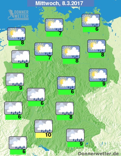 Am Mittwoch ist es besonders über der Osthälfte anfangs noch überwiegend aufgelockert, sonst oft schon stark bewölkt und nur zu Beginn noch trocken. Von Westen her ziehen jedoch dichte Wolken herein und es setzt Regen ein, der gegen Abend auch die östlichsten Landesteile erreicht. Die Temperatur steigt auf 6 Grad im Ostseeumfeld und bis 10 Grad im Raum Stuttgart.