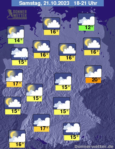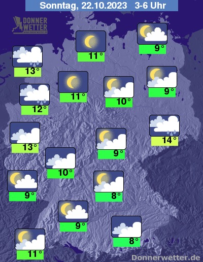 In der Nacht zum Sonntag ist es zunächst meist wechselnd bis stark bewölkt, im Norden teils sternenklar, dazu bleibt es weitgehend trocken. In der zweiten Nachthälfte ziehen kompakte Wolken in den Nordwesten und Westen des Landes und es fällt nachfolgend gebietsweise Regen. Die Temperatur sinkt auf 14 Grad in Dresden und 8 Grad in München.