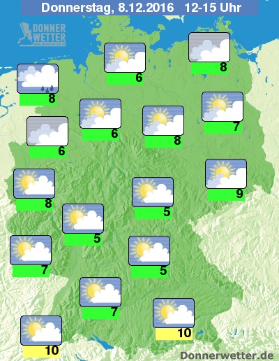 Die Höchstwerte liegen zwischen 5 Grad an der Rhön und 10 Grad in Baden und am Alpenrand.