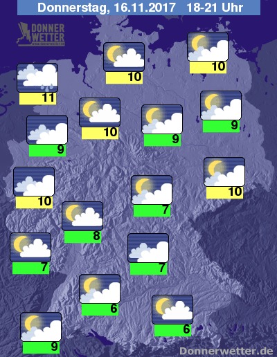 Am späten Nachmittag zeigt sich die Sonne nach einem wolkenreichen Tag dann auch im Norden noch einmal und auch im Süden geht es recht sonnig in den Abend. Lediglich zwischen Niederrhein und Nordsee versperren dichte Wolken den Blick gen Himmel und lassen es zeitweise leicht regnen.