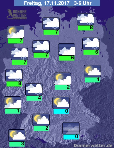 In der Nacht zu Freitag überquert dann ein Regenband die Nordhälfte des Landes, sodass es nördlich einer Linie Frankfurt-Berlin bis zum Morgen nass wird. Südlich dieser Linie ist der Himmel hingegen nur leicht bedeckt, stellenweise bildet sich jedoch in den Morgenstunden Nebel.