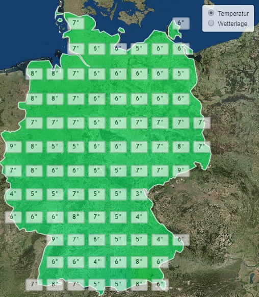 Am Tag liegen die Höchsttemperaturen zuvor bei kühlen 3 Grad im Grenzgebiet zwischen Bayern und Sachsen und bei milden 9 Grad am Oberrhein.