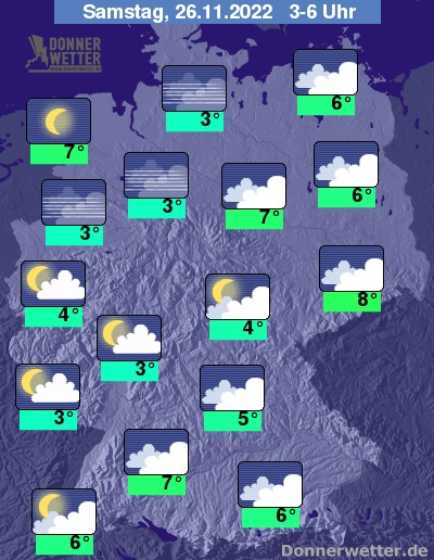 In der Nacht zum Samstag klingen auch die Niederschläge in den östlichen Landesteilen nach und nach ab, jedoch bleibt es über der Südosthälfte des Landes weitgehend bedeckt. Nach Nordwesten hin zeigt sich der Himmel dagegen zunehmend sternenklar, hier bleibt es weitgehend trocken. Stellenweise bildet sich Nebel. Die Temperatur sinkt auf 8 Grad in Dresden und etwa 3 Grad in Hannover.